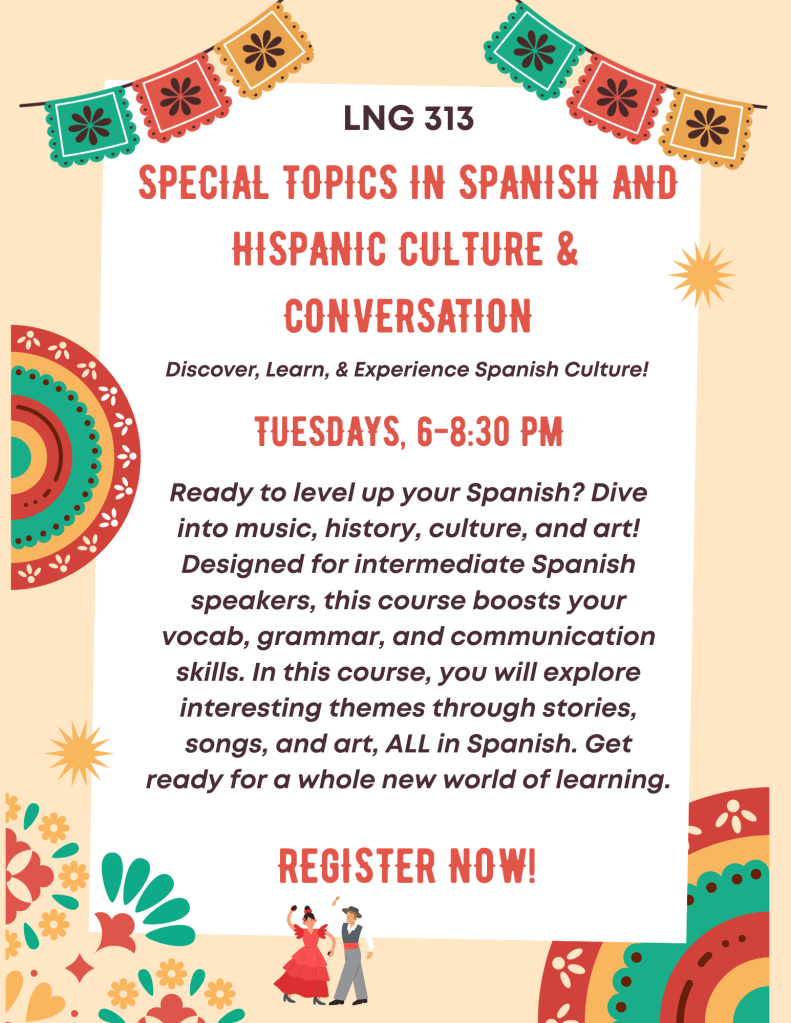 LNG313: Special Topics in Spanish available for this Fall Semester 26′ Special Topics of Hispanic Culture and Conversation